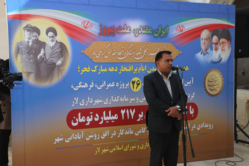 همزمان با نهمین روز از دهه مبارک فجر، آیین افتتاح و آغاز عملیات اجرایی ۲۶ پروژه عمرانی، فرهنگی، گردشگری و خدماتی شهرداری لار، با اعتباری افزون بر ۲۱۷ میلیارد تومان، صبح امروز در خانه تاریخی محمودی این شهر برگزار شد.